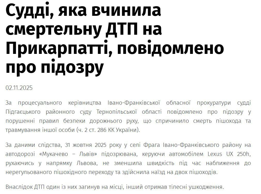 Суддя Підгаєцького районного суду Тернопільської області, яка перебувала за кермом Lexus UX 250h, не стала знижувати швидкість біля пішохідного переходу і наїхала на двох людей, які переходили дорогу в цьому місці.
