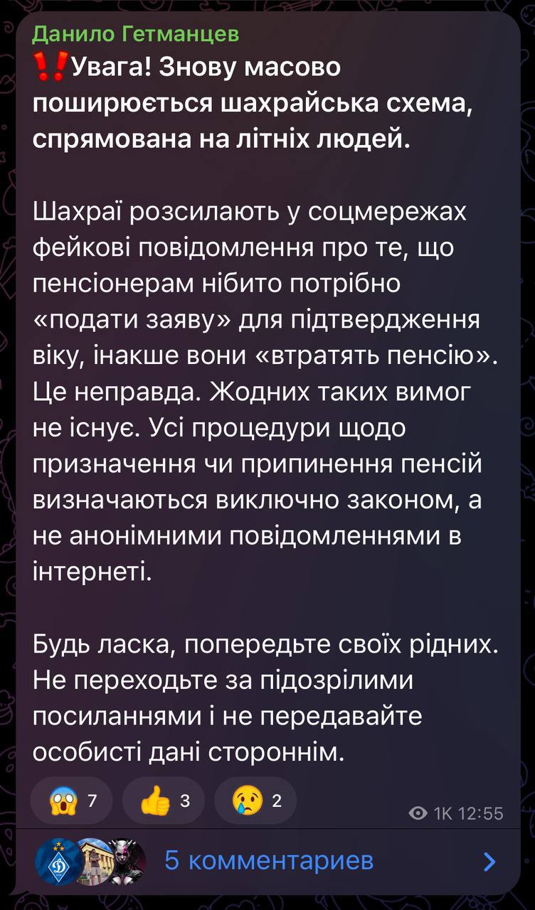 "Це неправда. Жодних таких вимог не існує. Усі процедури щодо призначення або припинення пенсій визначаються виключно законом, а не анонімними повідомленнями в інтернеті. Будь ласка, попередьте своїх близьких. Не переходьте за підозрілими посиланнями та не передавайте особисті дані стороннім", - написав Гетьманцев.