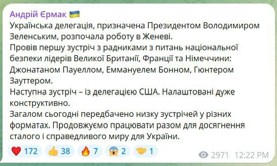 "Провів першу зустріч із радниками з національної безпеки лідерів Великобританії, Франції та Німеччини: Джонатаном Пауеллом, Еммануелем Бонном, Гюнтером Зауттером.