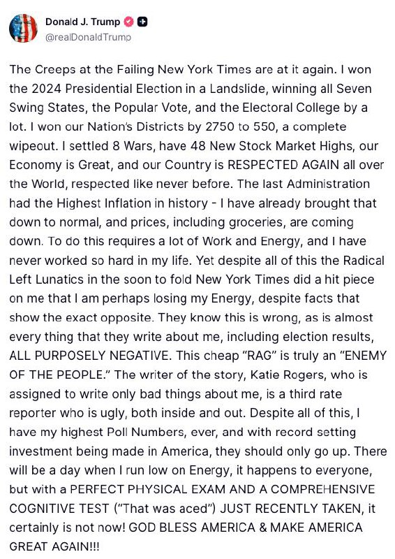 Як відомо, у статті NYT говорилося, що майже через рік другого терміну Трамп став постати перед пресою рідше. Газета писала, що він має коротший публічний графік, а іноді виявляє "ознаки втоми".