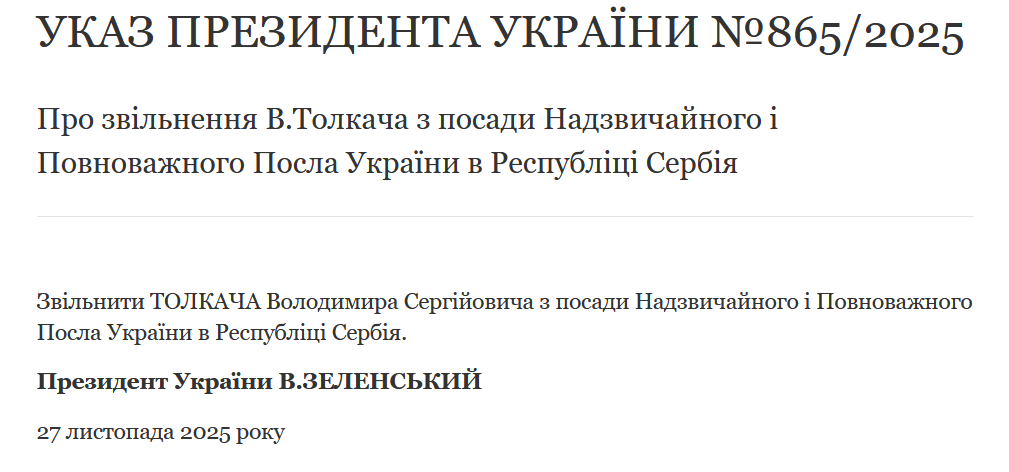 Іншим своїм указом Зеленський звільнив з посади посла України у Сербії Володимира Толкача.