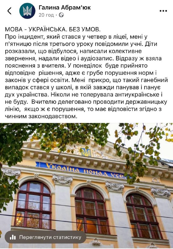 "Про інцидент, який стався в четвер у ліцеї, мені в п'ятницю після третього уроку повідомили учні. Діти розповіли, що сталося, написали колективне звернення, надали відео та аудіозапис. Відразу ж вимагала пояснень від вчителя. акнтиукраїнському і не буду.