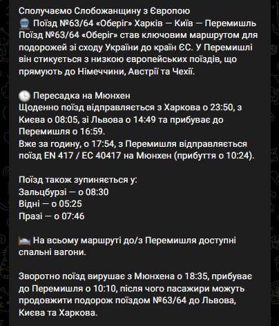 Ключовим маршрутом для поїздок зі сходу України до країн ЄС став поїзд №63/64 "Оберіг" Харків – Київ – Перемишль. У Перемишлі пасажири можуть пересісти на європейські поїзди до Німеччини, Австрії та Чехії.