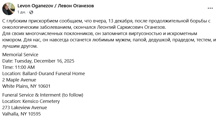 У США помер відомий радянський та російський піаніст та композитор, народний артист Росії Левон Оганезов. Йому було 84 роки.