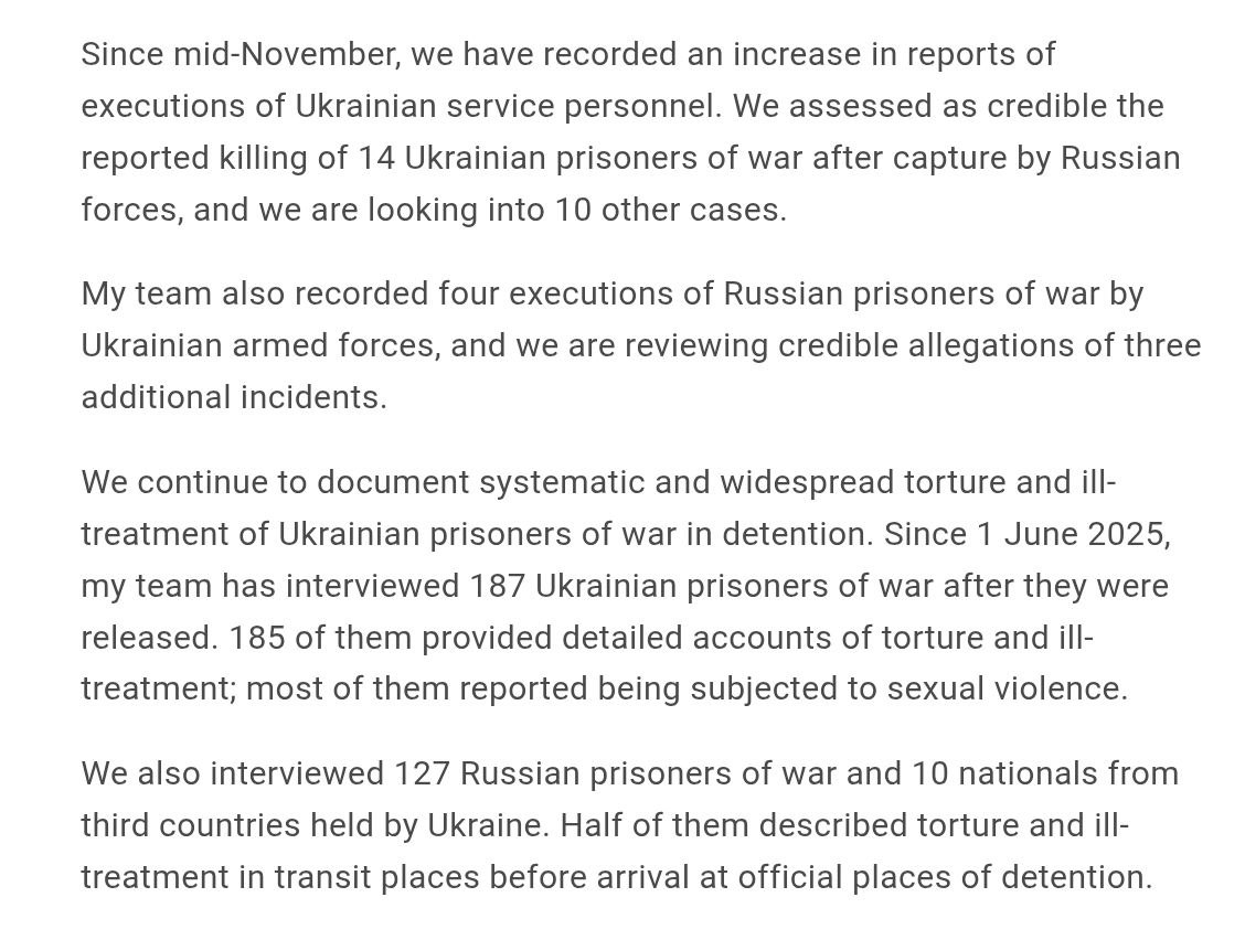 З 1 червня 2025 року співробітники ООН опитали 187 українських військовополонених після їхнього звільнення. 185 з них розповіли про тортури та жорстоке поводження, більшість заявили про сексуальне насильство.
