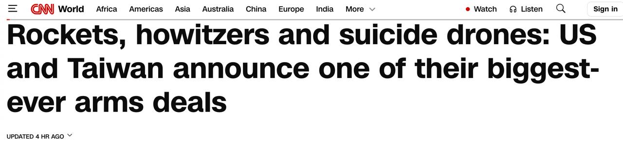А Китай, який розглядає Тайвань як провінцію, що відкололася, засудив цей крок, зазначивши, що він "серйозно підриває суверенітет, безпеку і територіальну цілісність Китаю". Представник Міністерства закордонних справ Китаю Го Цзякунь закликав США "дотримуватися принципу "єдиного Китаю" та негайно припинити небезпечні дії щодо озброєння Тайваню".