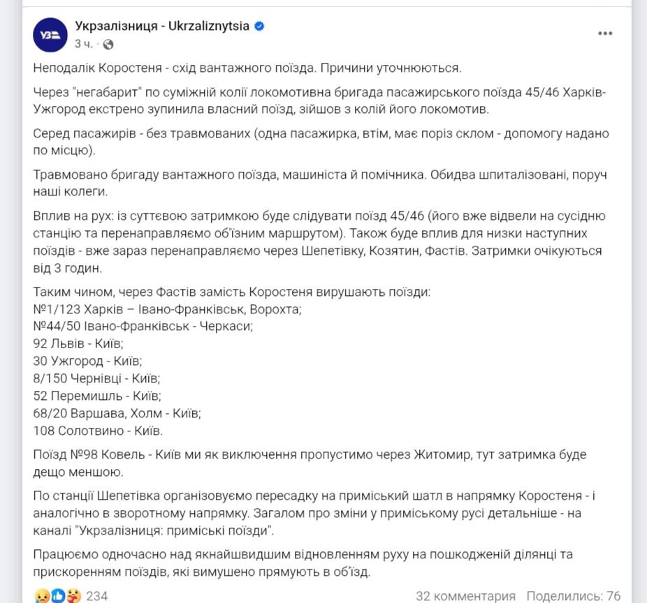 Вночі на Житомирщині зійшов з рейок вантажний потяг, а також локомотив пасажирського поїзда Харків–Ужгород.