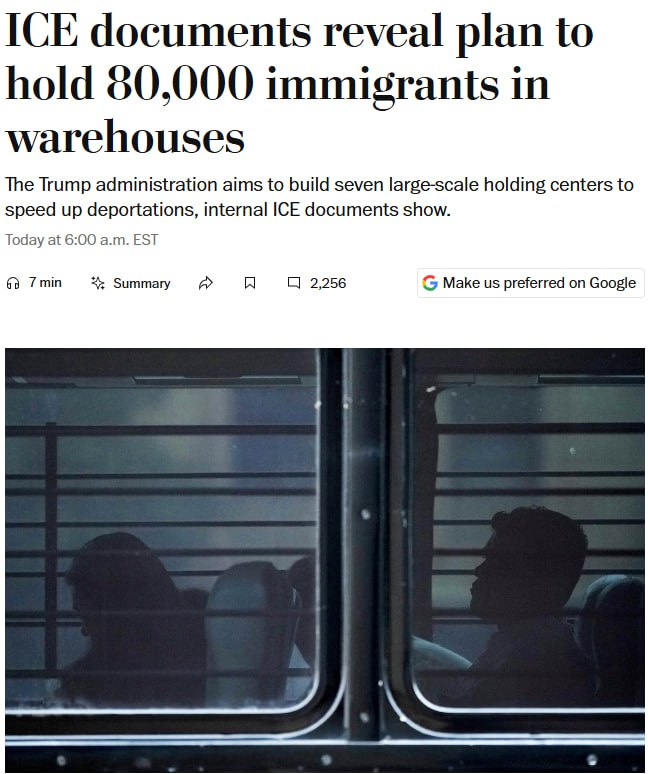 "Адміністрація Трампа шукає підрядників, які допоможуть їй змінити систему утримання іммігрантів у США. План включає реконструкцію промислових складів для утримання понад 80 тисяч іммігрантів одночасно", - йдеться у статті.