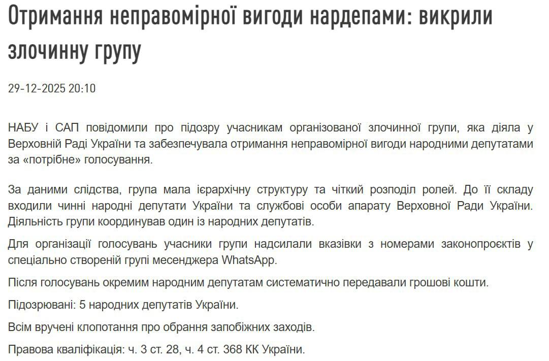 Заявляється, що НАБУ та САП повідомили про підозру 5 нардепам-учасникам "організованої злочинної групи, яка діяла у Верховній Раді України та забезпечувала отримання неправомірної вигоди народними депутатами за "потрібне" голосування. Група мала ієрархічну структуру та чіткий поділ ролей".