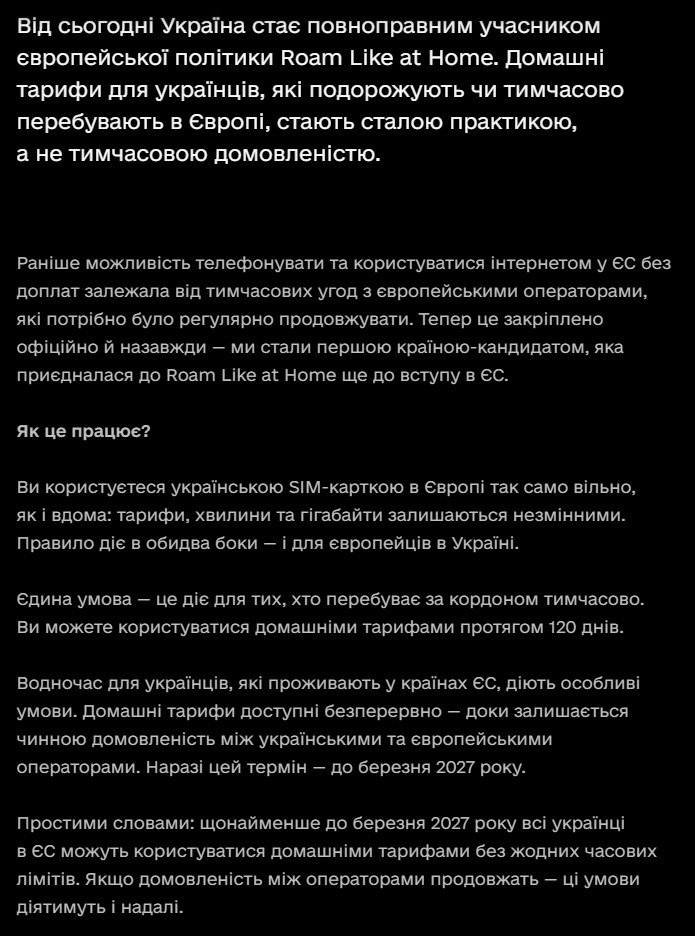 При цьому для українців, що постійно проживають у країнах ЄС, діють особливі умови: домашні тарифи доступні безперервно, поки залишається в силі домовленість між українськими та європейськими операторами. Поки що цей термін встановлений до березня 2027 року. Тобто досі всі українці в ЄС можуть користуватися домашніми тарифами без тимчасових лімітів.