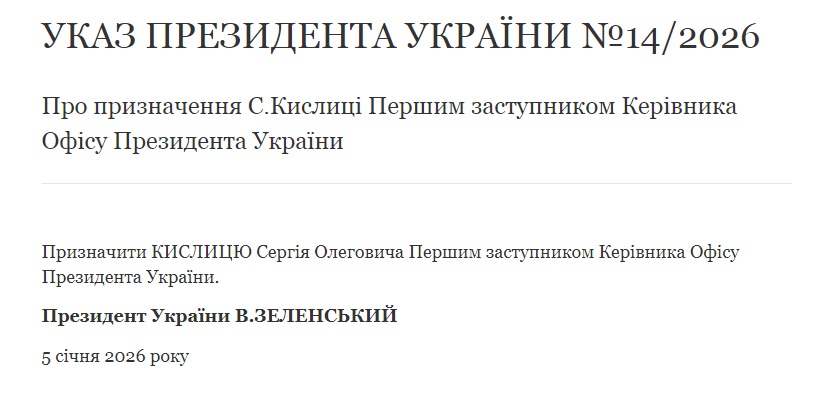 Указ про призначення №14/2026 опубліковано на сайті президента.