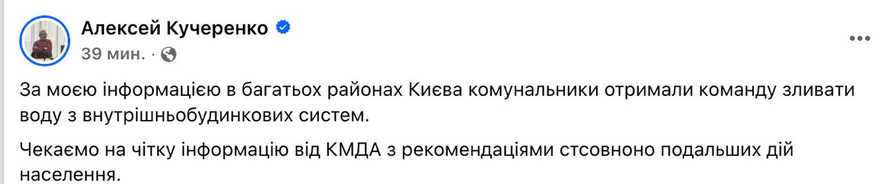 "За моєю інформацією, у багатьох районах Києва комунальники отримали команду зливати воду з внутрішньобудинкових систем. Чекаємо на чітку інформацію від КМДА з рекомендаціями щодо подальших дій населення", - сказано в публікації.