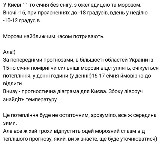 Вона додала, що за попередніми прогнозами у більшості областей України з 15 січня морози помірної чи більшої сили відступлять, а 16–17 січня вдень очікується потепління та можливо відлига.
