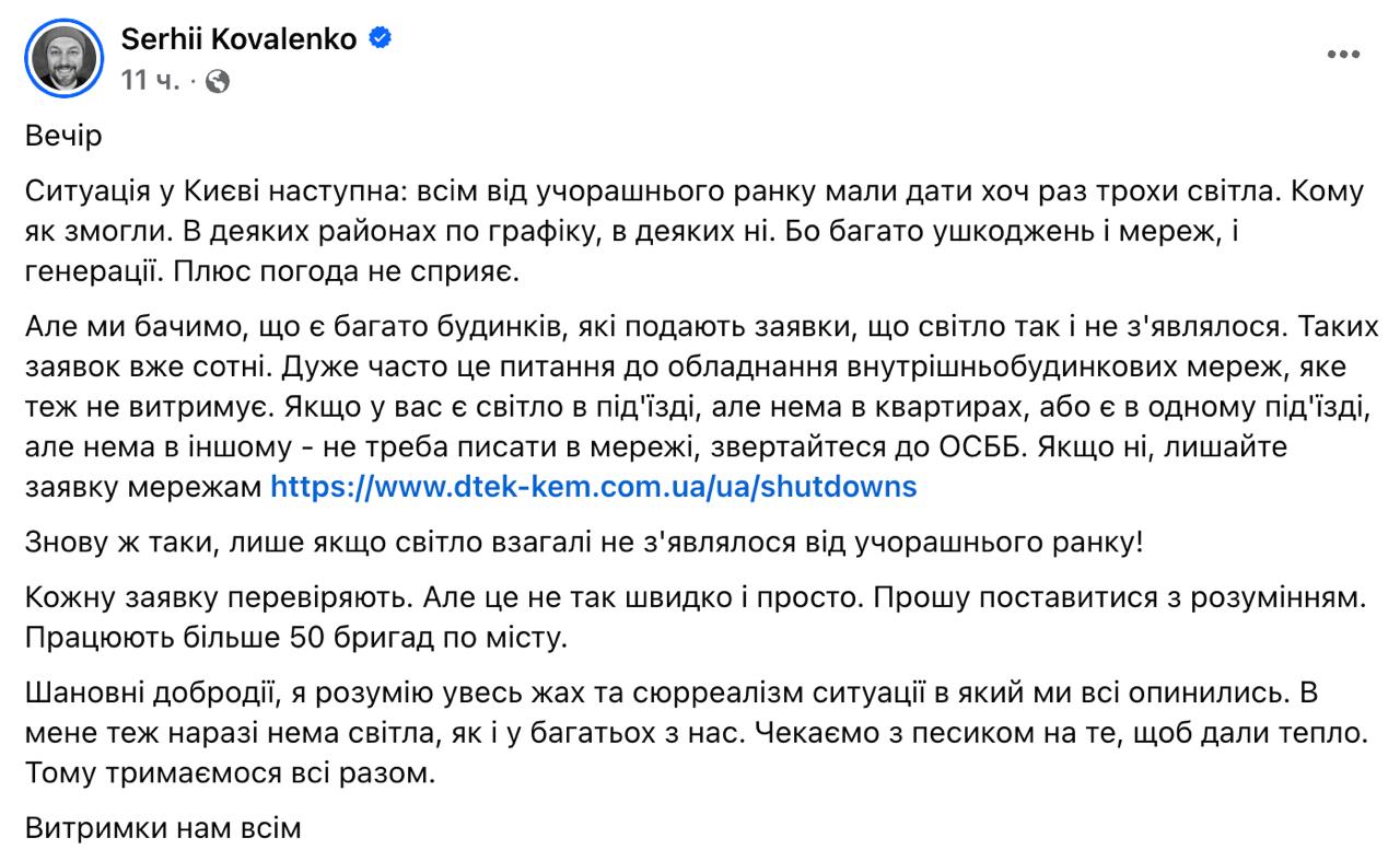 "Ми бачимо, що є багато будинків, які подають заявки про те, що світло так і не з'являлося. Таких заявок вже сотні. Дуже часто це питання до обладнання внутрішньобудинкових мереж, яке теж не витримує. Кожну заявку перевіряють. Але це не так швидко і просто. Прошу поставитися з розумінням. У місті працюють понад 50 бригад", - сказав він.
