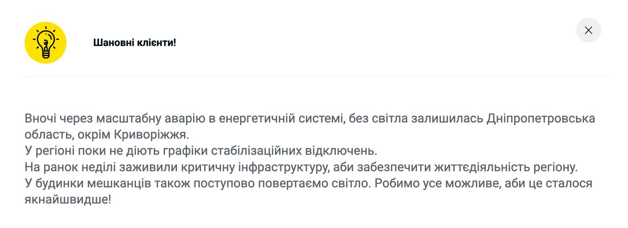 Перебої з електропостачанням також спостерігаються у Дніпропетровській області. За даними ДПЕК, уночі сталася аварія в енергосистемі.