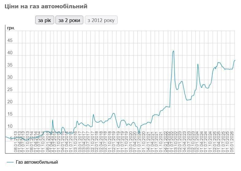 Вищі ціни фіксувалися лише на початку повномасштабної війни, коли на тлі паніки, кілометрових черг на АЗС та обмежень на продаж палива по 10 літрів в один бак автогаз коштував понад 42 грн за літр.