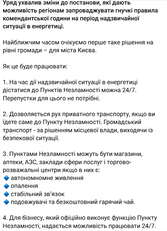 Згідно з нововведеннями, громадяни та приватний транспорт зможуть пересуватися вночі, щоб дістатися пункту обігріву (за аналогією з укриттям під час тривоги), місцева влада може ухвалити рішення про роботу таксі та громадського транспорту, а для бізнесу, який офіційно виконує функції пункту незламності, надається можливість працювати цілодобово.