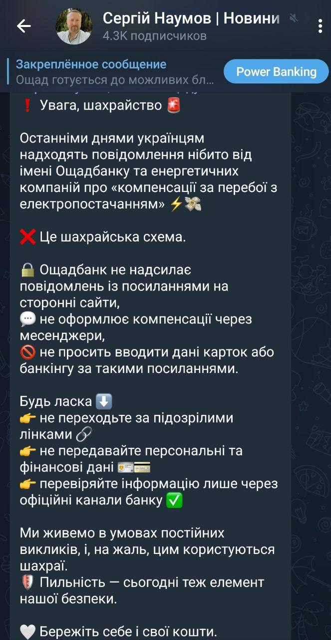 "В останні дні українцям надходять повідомлення нібито від імені Ощадбанку та енергетичних компаній про "компенсації за перебої з електропостачанням". Це шахрайська схема. Ощадбанк не надсилає повідомлень з посиланнями на сторонні сайти, не оформляє компенсації через месенджери, не просить вводити дані карток або банкінгу".
