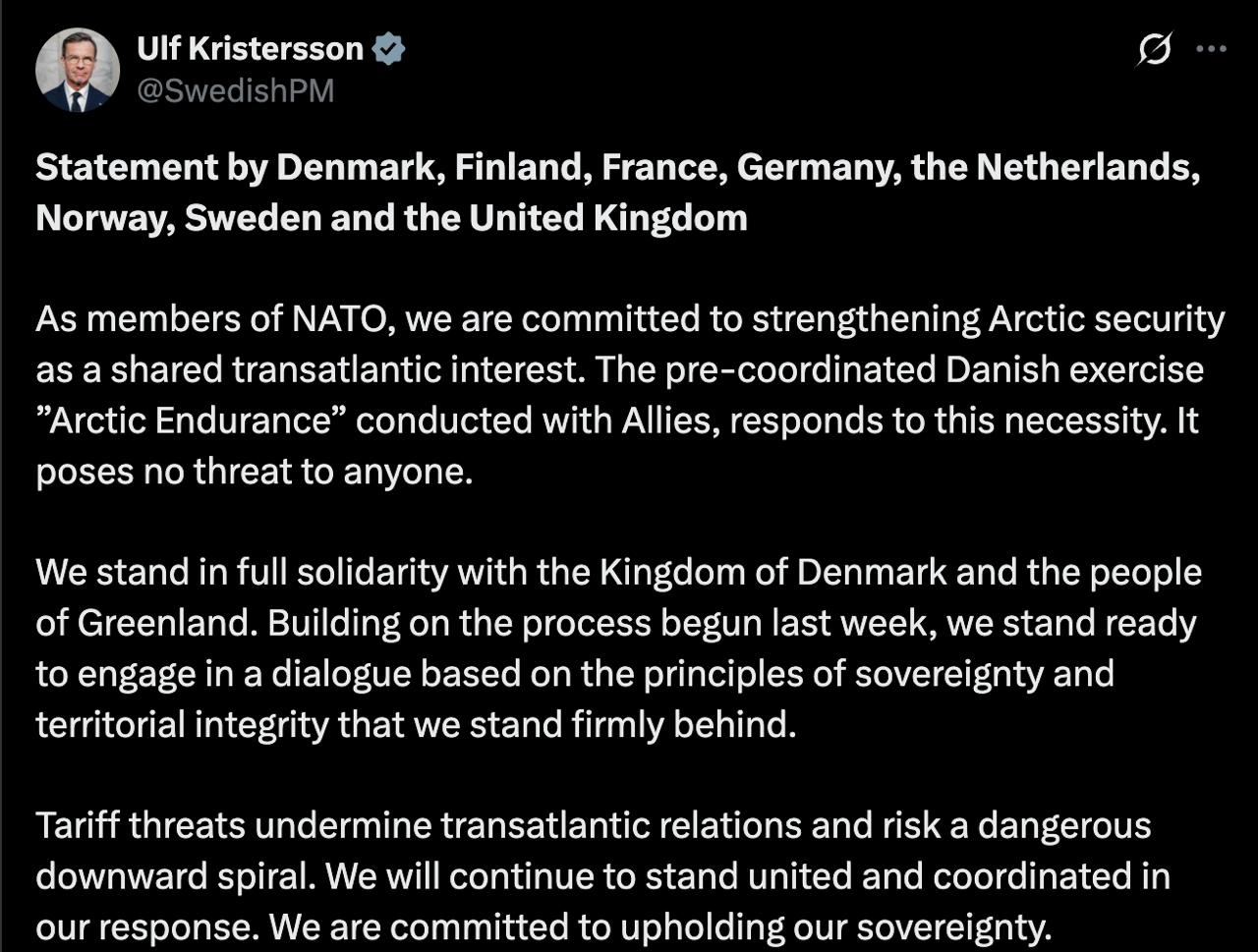 "Тарифні загрози підривають трансатлантичні відносини і загрожують небезпечною спіраллю, що сходить. Ми будемо і надалі діяти одностайно і скоординовано. Ми віддані захисту нашого суверенітету", - заявили Данія та її союзники.