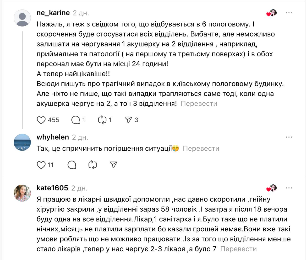 "Я працюю в лікарні швидкої допомоги, нас давно скоротили, гнійну хірургію закрили, у відділенні зараз 58 осіб. І завтра я після 18 вечора буду одна на все відділення. Лікар, одна санітарка і я. Було таке, що не платили нічних, місяць не платили зарплати, бо грошей нема. Вони вже такі умови роблять, що неможливо працювати. Тепер у нас чергує 2-3 лікарі, а було сім", - описала ситуацію коментатор.