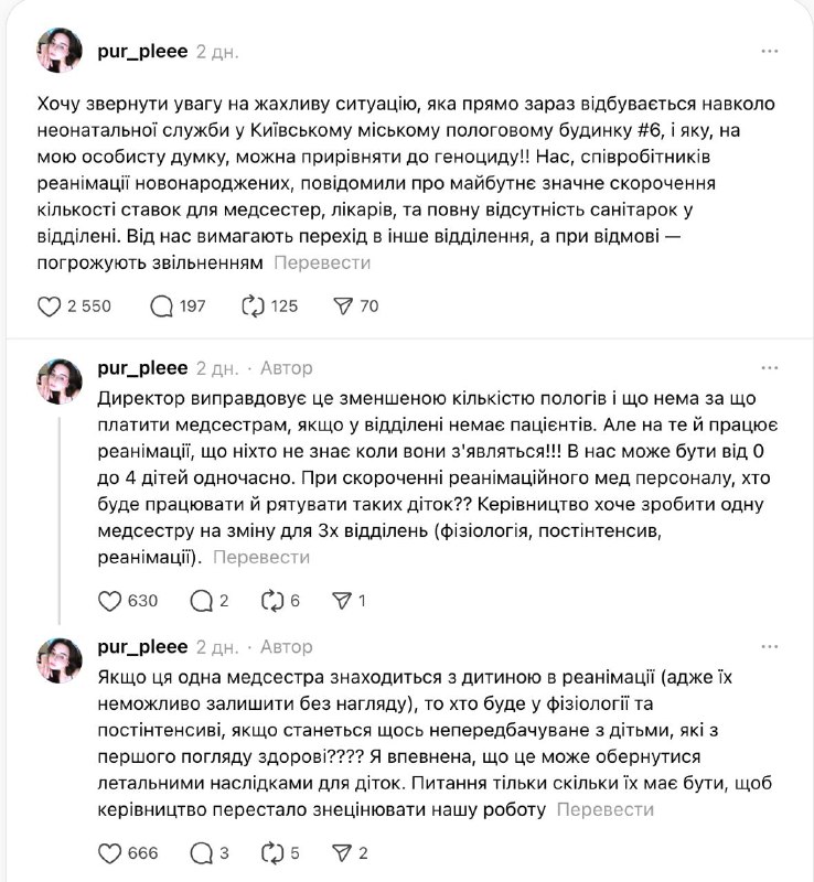 "Хочу звернути увагу на жахливу ситуацію, яка прямо зараз відбувається навколо неонатальної служби в київському міському пологовому будинку №6... Нам, співробітникам реанімації новонароджених, повідомили про майбутнє значне скорочення кількості ставок для медсестер, лікарів і повну відсутність санітарок у відділенні. Від нас вимагають перейти до іншого відділення, а за відмову загрожують звільненням. Директор виправдовує це зменшеною кількістю пологів – мовляв, за що платити медсестрам, якщо у відділенні немає пацієнтів. Але на те працює реанімація, що ніхто не знає, коли вони з'являться! В нас може бути від 0 до 4 дітей одночасно. При скороченні реанімаційного медичного персоналу хто працюватиме та рятуватиме таких дітей? Керівництво хоче зробити одну медсестру за зміну для трьох відділень (фізіологія, постінтенсив, реанімація)", - сказано у публікації.