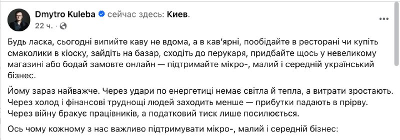 Йому зараз найважче. Через удари по енергетиці немає світла і тепла, а витрати зростають. Через холод і фінансові труднощі людей заходить менше, доходи падають у прірву. Через війну не вистачає працівників, а податковий тиск лише посилюється", - написав Кулеба.