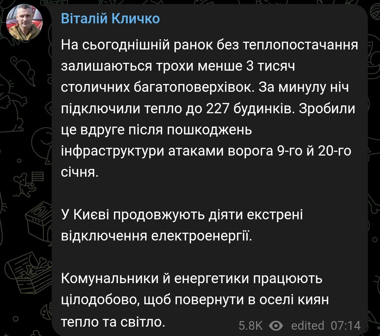 08:21 У Києві без опалення лишається близько трьох тисяч багатоквартирних будинків, повідомив Кличко. За його словами, за минулу ніч подачу опалення відновили у 270 будинках.