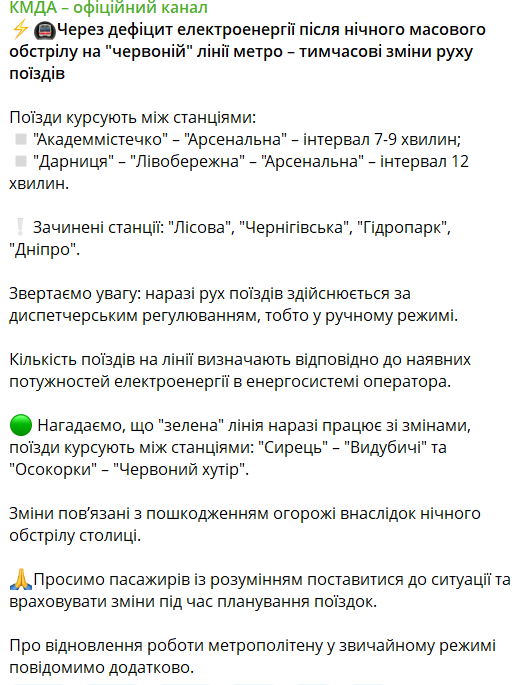 При цьому у Києві через дефіцит електроенергії також зі змінами курсують потяги на червоній лінії метро.