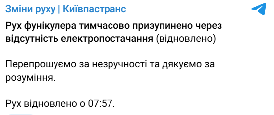 Також через відсутність електропостачання тимчасово припинялася робота фунікулера, повідомили у Київпастрансі.
