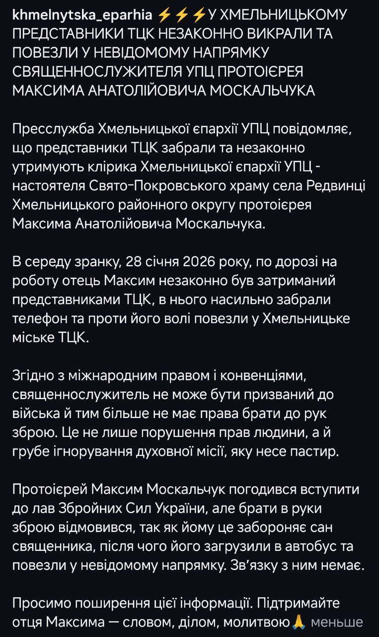 У Хмельницькому працівники ТЦК та СП насильно мобілізували священика УПЦ, настоятеля Свято-Покровського храму села Редвинці Хмельницького районного округу протоієрея Максима Москальчука. Його викрали та відвезли у невідомому напрямку.
