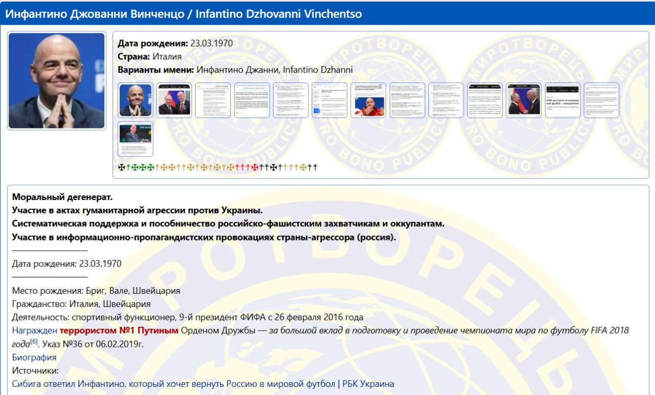 Президента Міжнародної федерації футболу (ФІФА) Джанні Інфантіно внесли до бази українського сайту "Миротворець".
