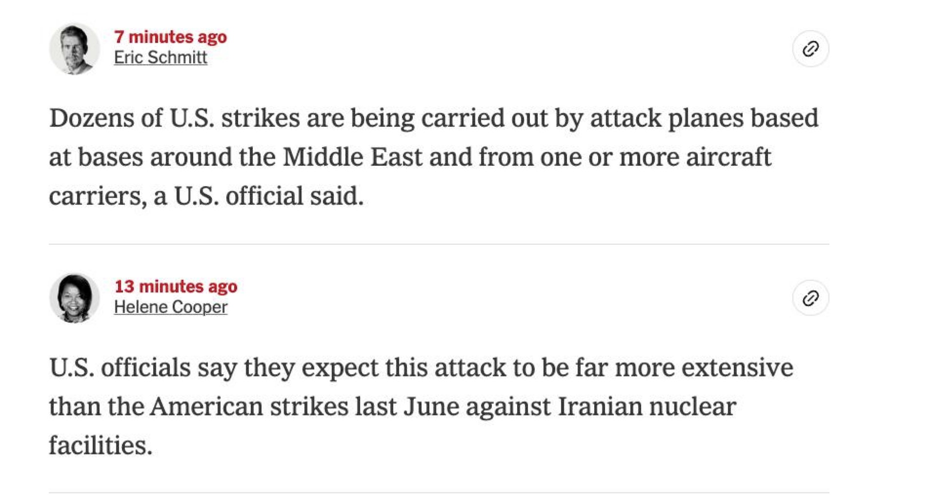 «Десятки американських ударів наносяться штурмовиками, які базуються на базах по всьому Близькому Сходу, а також з одного або кількох авіаносців, – повідомив американський чиновник. Американські офіційні особи заявляють, що ця атака буде набагато масштабнішою, ніж американські удари по іранських ядерних об'єктах у червні минулого року», - пише газета.