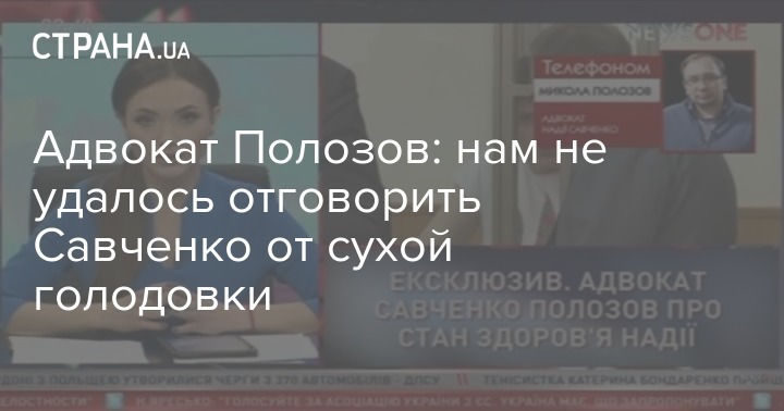 Адвокат Николай Полозов сообщил в эфире News One, что с завтрашнего дня Надежды Савченко начинает сухую голодовку. Отговорить ее не удалось ни адвокатам, ни ее сестре Вере. Говорит, реальное состояние Савченко определить трудно, так как от российских врачей она отказывается, а украинских к ней не пускают.