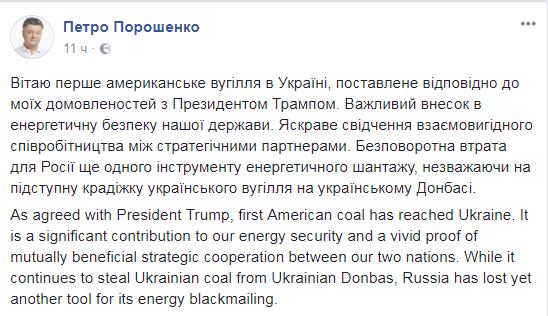 "Поздравляю первый американский уголь в Украине, поставленный согласно моих договоренностей с Президентом Трампом. Важный вклад в энергетическую безопасность нашего государства. Яркое свидетельство взаимовыгодного сотрудничества между стратегическими партнерами. Безвозвратная потеря для России еще одного инструмента энергетического шантажа, несмотря на коварную кражу украинского угля на украинском Донбассе", - написал Порошенко.