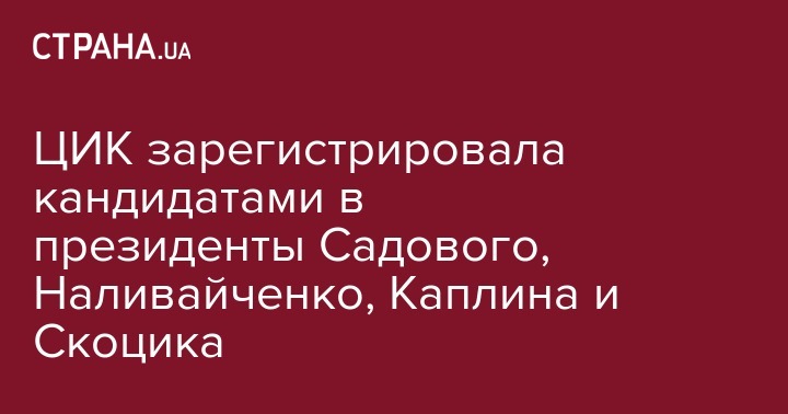 Центральная избирательная комиссия Украины зарегистрировала еще четырех кандидатов в президенты страны: мэра Львова, лидера партии "Самопомощь" Андрея Садового, лидера партии "Общественно-политическое движение "Справедливость" Валентина Наливайченко, лидера Социал-демократической партии Сергея Каплина, самовыдвиженца Виталия Скоцика.